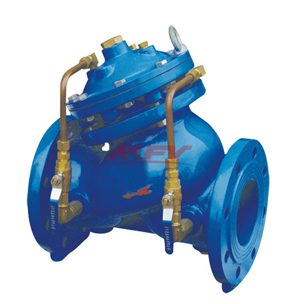 多功能水泵控制閥由主閥和調節閥及接管系統組成,閥體采用直流式閥體,主閥控制室為膜片式或活塞式的雙控制室結構,控制室比一般水力控制閥增加了一個,增加了對主閥的控制功能,實現了對水泵出口的緩慢開啟、全開、緩閉、截止等多功能控制,實現了一個閥門、一次調節對水泵出口的多功能控制。